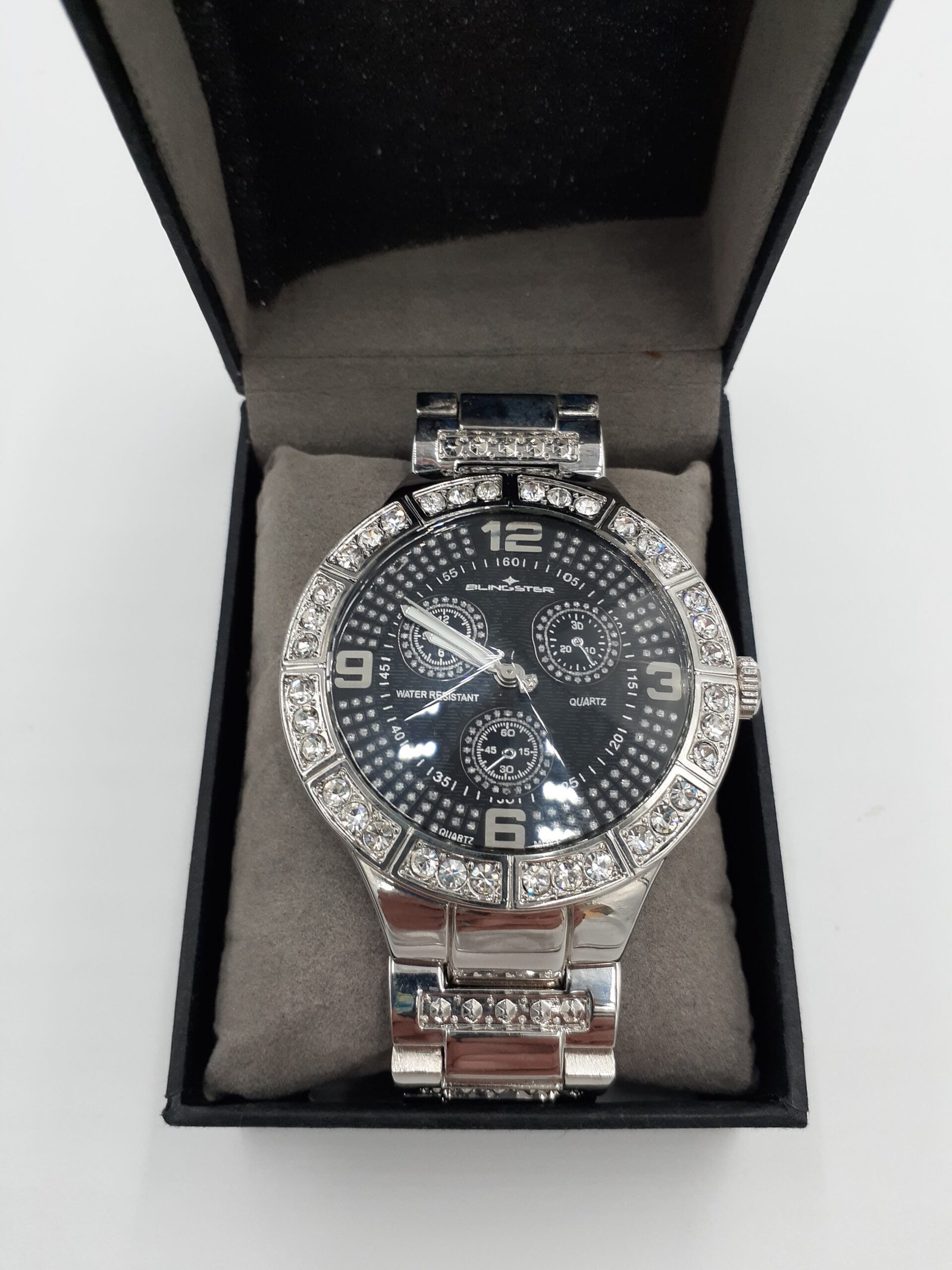 A bold, modern watch built to stand out. Featuring a black dial with multi-function styling and a crystal-accented bezel, this piece delivers strong wrist presence.